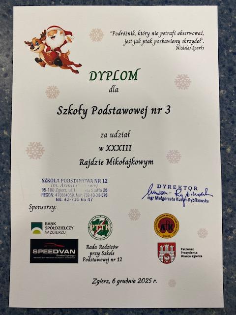 W dniu 6 grudnia br. chętni uczniowie naszej szkoły wraz z opiekunami p. Anną Dworakowską i p. Katarzyną Juszczak wzięli udział w XXXIII Rajdzie Mikołajkowym organizowanym przez Szkołę Podstawową nr 12 w Zgierzu pod honorowym patronatem Prezydenta Miasta Zgierza.